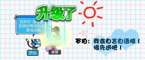 罗伯作为有点小智商的机器宠,很喜欢自言自语哦!当你升级了、宠物消费的HP药水不足时、宠物消费的MP药水不足等情况时,罗伯会自动说话哟!是不是很贴心呀? :)